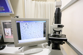 患者さまのお口の中の汚れを少し取って、「位相差顕微鏡」と呼ばれる顕微鏡を使用して観察をします。この顕微鏡を使用すると、歯周病菌がいるか、カビが多いのかなど菌の状態を確認することができます。